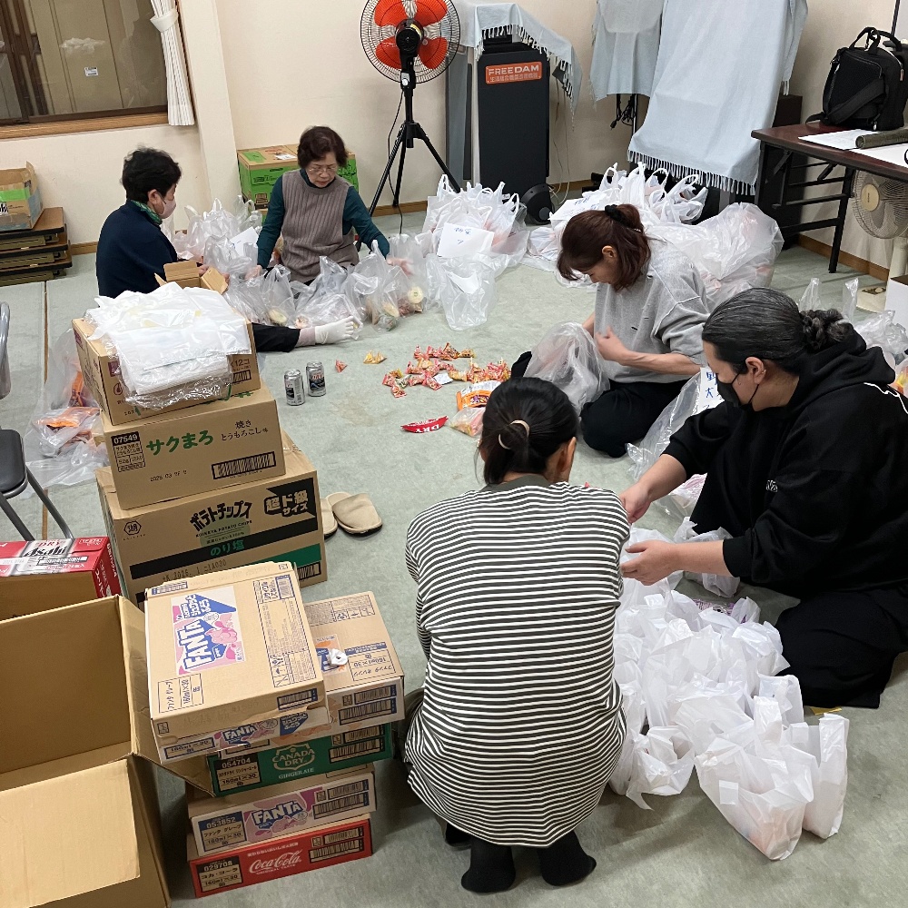 26日に予定されておりました山車・神輿の巡行、もちつきなど全ての行事が中止となりましたため、お祭りで提供予定の菓子やおにぎりなどを個別の袋に詰める作業を実施いたしました。お手伝いを予定されていた方への配布は26日(日)の11時30分から12時30分の間に行います。