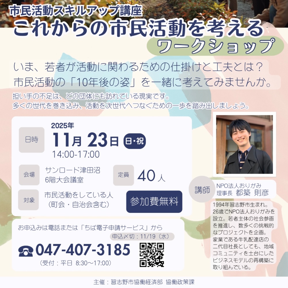 令和7年11月23日(日)14時から、サンロード津田沼6階大会議室で「令和7年度習志野市市民活動スキルアップ講座・これからの市民活動を考えるワークショップ」が開催されました。高齢化や担い手不足が課題となっている中、『なぜ、いま若者が地域に関わるのか』『若者の輪が広がる仕掛けと工夫』をテーマに、若者の社会活動の参画を数多く企画・実践している講師が、地域の未来について一緒に考える講座です。今回の講師は、「NPO法人おりがみ」理事長の都築則彦氏でした。(協働経済部・協働政策課)