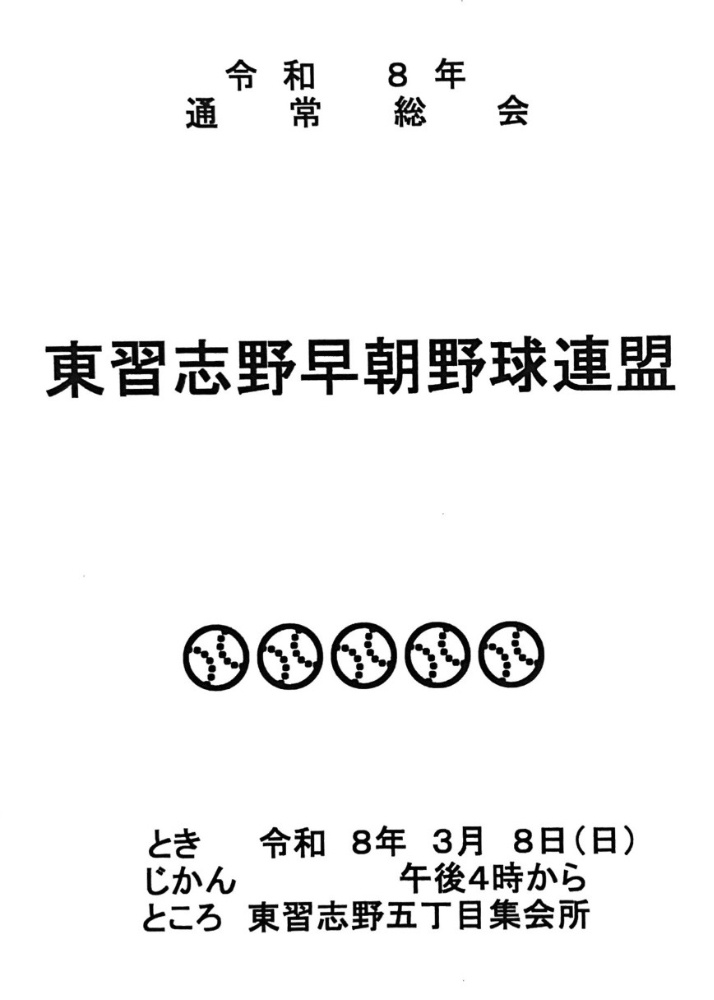 令和8年3月8日(日)16時より、東習志野早朝野球連盟の通常総会が開催され、私も出席いたしました。東習志野地区には6つの早朝野球チームが存在しておりましたが、今年のリーグ戦からは5チームに減少することとなりました。人材不足が原因で、実花パンサーズは1年間の休部を余儀なくされました。(東習志野連合町会)
