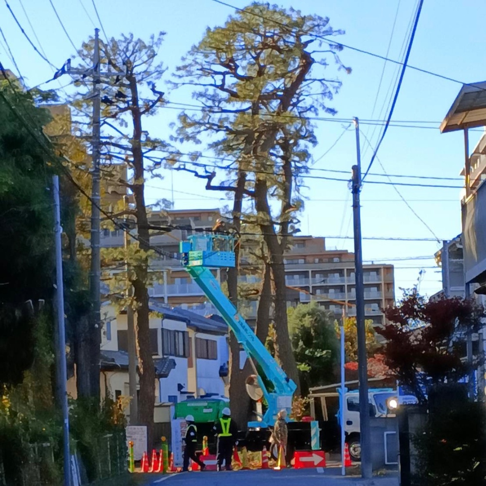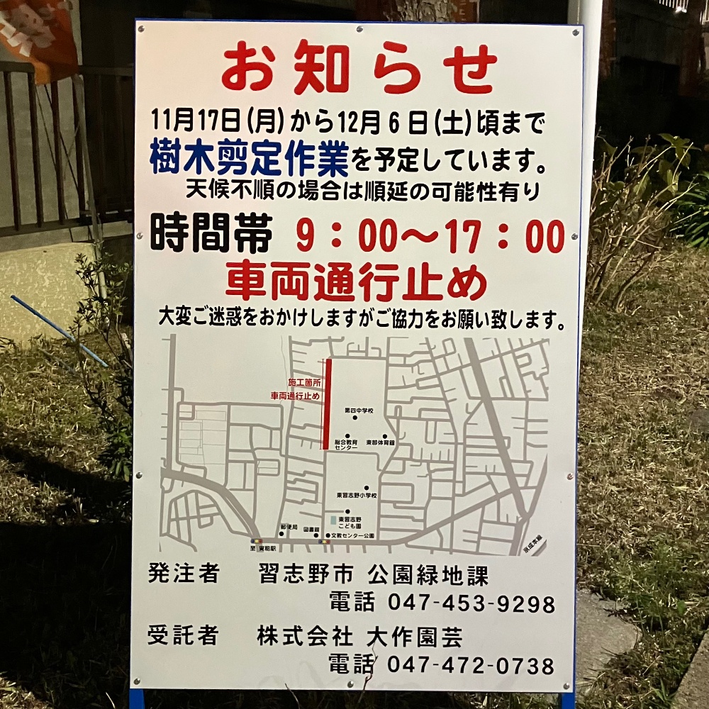 令和6年10月31日、文教通り沿いの松並木の剪定作業の日程が決まり、通行止めの看板が設置されることになりました。