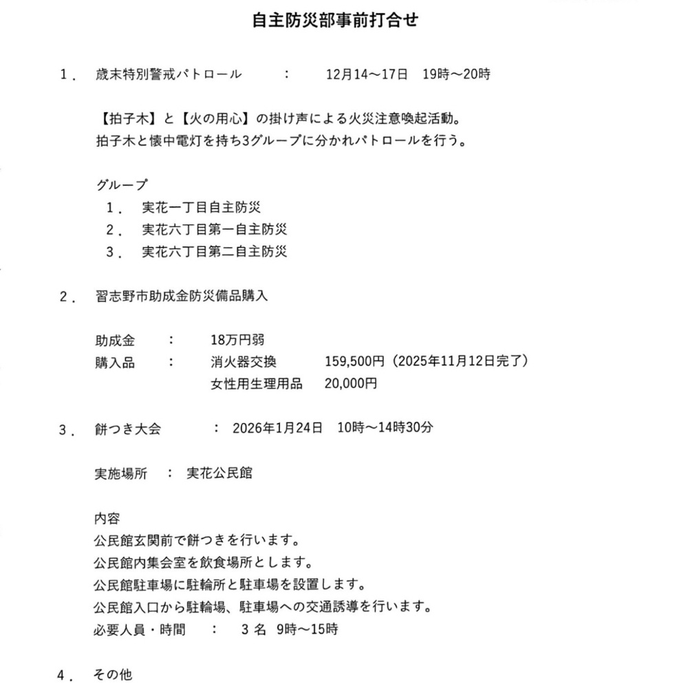令和7年12月6日(土)19時より、実花町会自主防災部の会議が開催されました。会議では、①令和7年度歳末特別警戒パトロールについて、②令和7年度防災備品購入について、③餅つき大会について、④その他が協議されました。(実花町会)